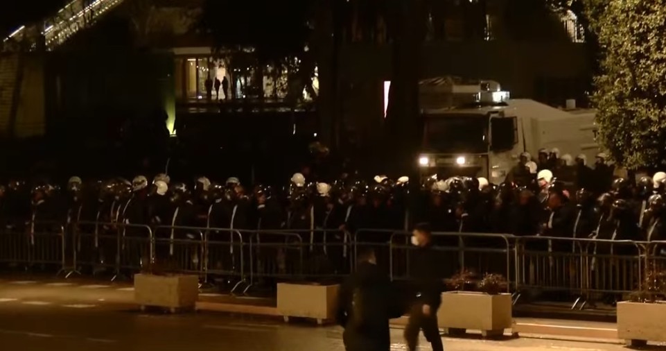 Efektivët e policisë kanë vënë maskat kundërgaz dhe janë rreshtuar pas gardhit metalik.