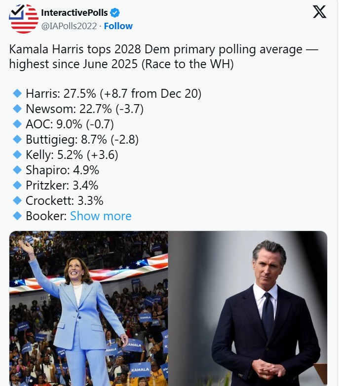 Megjithatë, një tjetër sondazh i realizuar nga Focaldata më 10 shkurt, me një kampion prej 1,148 të anketuarish, konfirmon epërsinë e Harris me 39% mbështetje, krahasuar me 21% për Newsom. Në të njëjtin sondazh, Ocasio-Cortez siguron 10%, ndërsa Buttigieg dhe Shapiro marrin nga 7% secili.