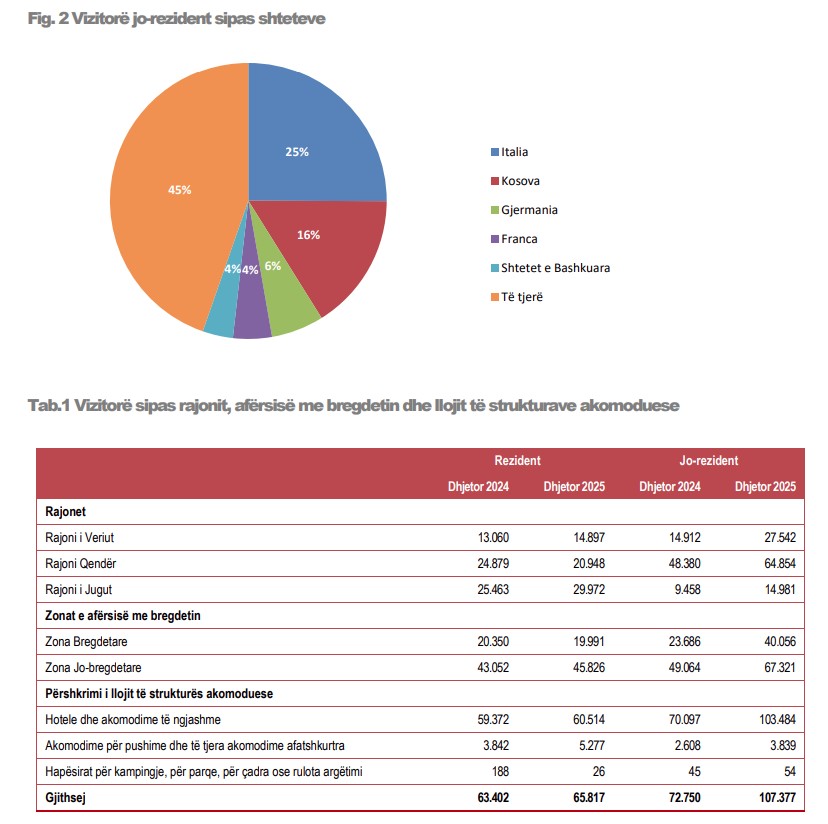 “Në Dhjetor 2025, shumica e vizitorëve jo-rezidentë të cilët u akomoduan në strukturat pritëse në Shqipëri vijnë nga Italia (25%), Kosova (16%) dhe Gjermania (6%).