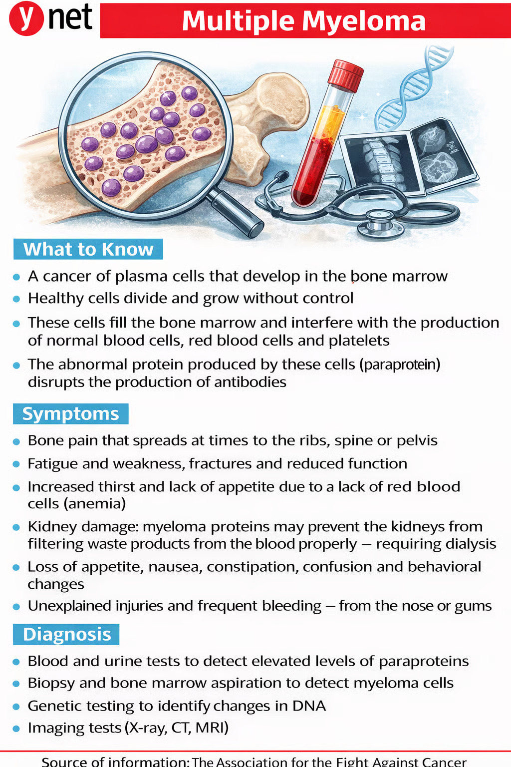 Mieloma është një kancer i qelizave plakmatike në gjak — qelizat në palcën e kockave përgjegjëse për prodhimin e antitrupave dhe mbrojtjen e trupit nga infeksionet. Kur këto qeliza bëhen kanceroze, ato shumohen në mënyrë të pakontrolluar dhe dëmtojnë kockat, veshkat dhe prodhimin normal të gjakut.