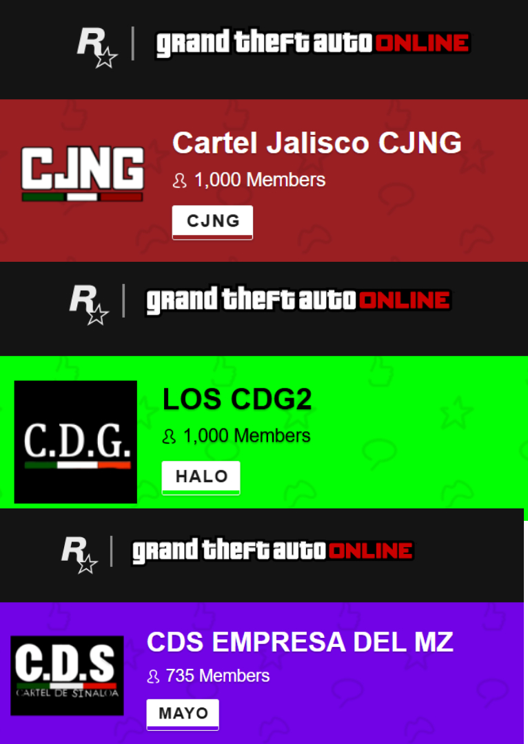 Midis këtij normalizimi kulturor dhe simulimeve më realiste qëndron Grand Theft Auto Online, ku sistemi i “crews” u lejon lojtarëve të krijojnë fraksione të përhershme rreth çdo emri apo simboli që dëshirojnë. Qindra prej këtyre ekuipazheve janë ndërtuar rreth identiteteve të vërteta të karteleve dhe shumë prej tyre kanë qindra anëtarë.