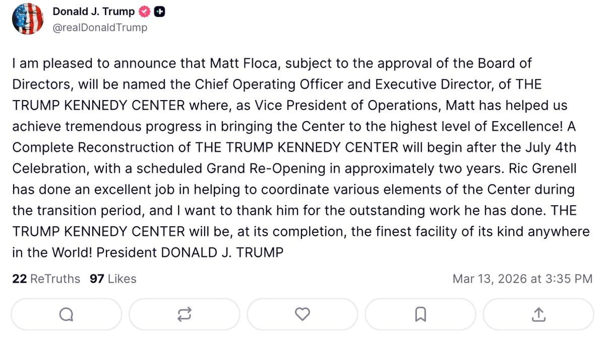 “Kam kënaqësinë të njoftoj se Matt Floca, në varësi të miratimit të Bordit të Drejtorëve, do të emërohet Drejtor Operativ dhe Drejtor Ekzekutiv i QENDRËS TRUMP KENNEDY ku, si Zëvendëspresident i Operacioneve, Matt na ka ndihmuar të arrijmë përparim të jashtëzakonshëm në sjelljen e Qendrës në nivelin më të lartë të Ekselencës! Një Rikonstruksion i Plotë i QENDRËS TRUMP KENNEDY do të fillojë pas Festimeve të 4 Korrikut, me një Rihapje të Madhe të planifikuar në afërsisht dy vjet. Ric Grenell ka bërë një punë të shkëlqyer duke ndihmuar në koordinimin e elementeve të ndryshme të Qendrës gjatë periudhës së tranzicionit, dhe dëshironi ta falënderoj atë për punën e jashtëzakonshme që ka bërë. QENDRA TRUMP KENNEDY do të jetë, në përfundim të saj, objekti më i mirë i llojit të tij kudo në Botë! Presidenti DONALD J. TRUMP.”