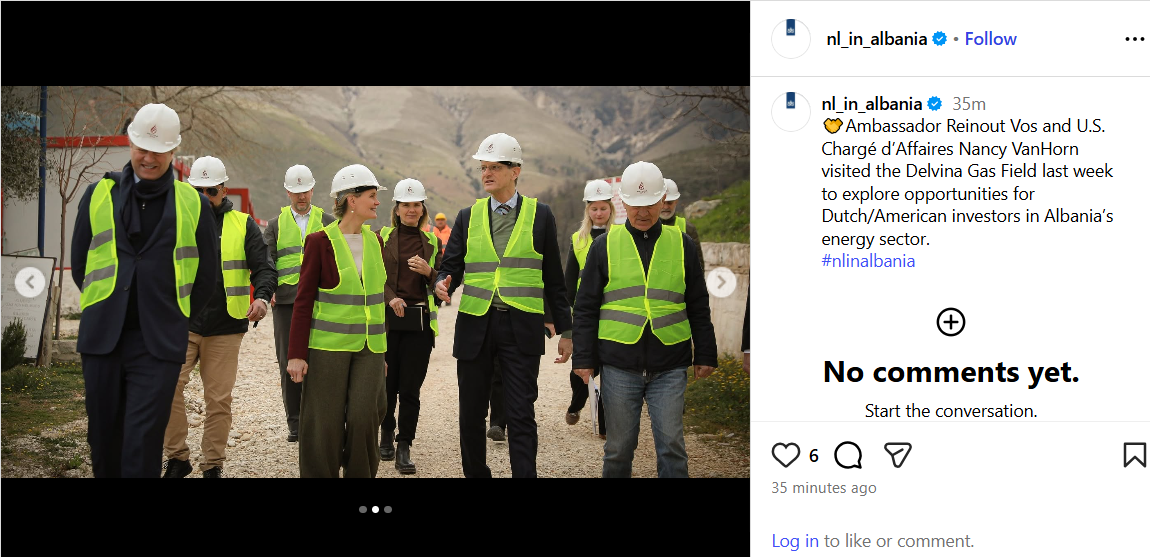 Presidenti Trump po nxit një epokë të re të rritjes së prodhimit energjetik amerikan, me investimet amerikane që forcojnë sigurinë energjetike globale. Duke theksuar rëndësinë e një mjedisi rregullator transparent për tërheqjen e investimeve ndërkombëtare, e Ngarkuara me Punë Nancy VanHorn dhe Ambasadori holandez Reinout Vos vizituan Fushën e Gazit në Delvinë javën e kaluar për të eksploruar mundësitë në sektorin energjetik të Shqipërisë.”- thuhet në postimin Ambasadës së SHBA-ve.