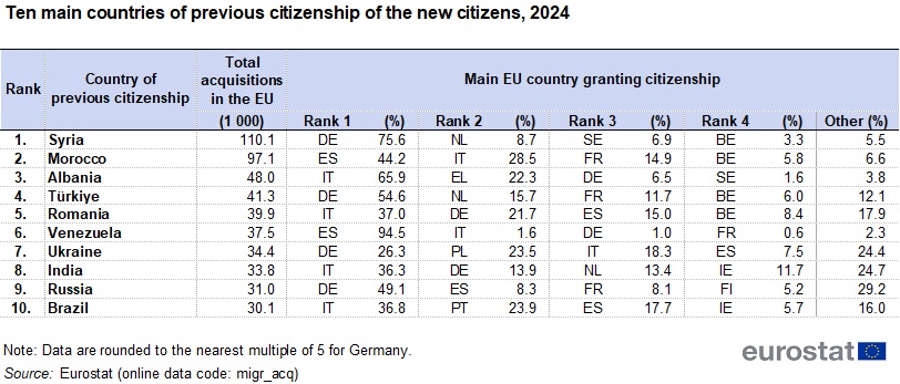 Në vitin 2024, ashtu si edhe një vit më parë, shtetasit sirianë përbënin grupin më të madh të qytetarëve të rinj të BE-së, me 110 100 shtetësi të dhëna. Shtetasit marokenë ishin grupi i dytë më i madh, me 97 100 shtetësi të dhëna, të ndjekur nga shqiptarët (48 000).