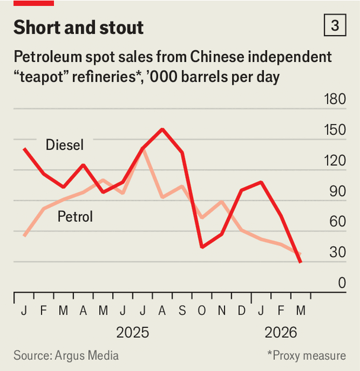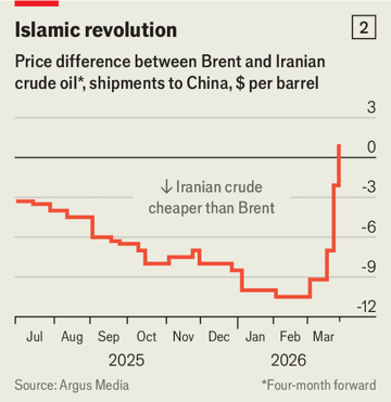 Para luftës, këto rafineri përfitonin ulje prej 18–24 dollarësh për fuçi krahasuar me çmimin Brent për naftën Iranian Light. Tani që furnizimet e tjera nga Gjiri janë pakësuar, ulja është tkurrur në 7–12 dollarë për fuçi. Duke përfshirë koston e transportit nga Malajzia, nafta iraniane e dorëzuar në Kinë është tashmë më e shtrenjtë se ajo Brent. Vetë Brent-i është rritur ndjeshëm, duke e çuar çmimin e kontratave të ardhshme për një fuçi iraniane në rreth 104 dollarë – rreth 75% më shumë se para luftës.