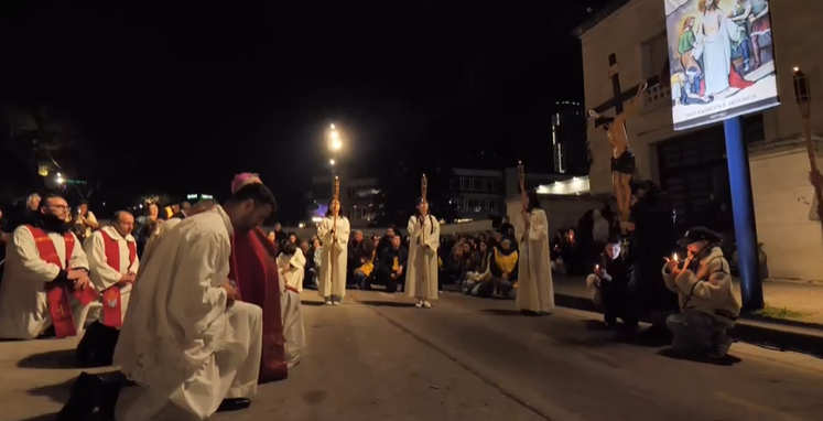 Sheshi “Nënë Tereza” u mbush me qindra besimtarë, të cilët ndoqën me përkushtim 14 ndalesat simbolike që pasqyrojnë vuajtjet dhe sakrificën e Jezu Krishti drejt kryqëzimit.