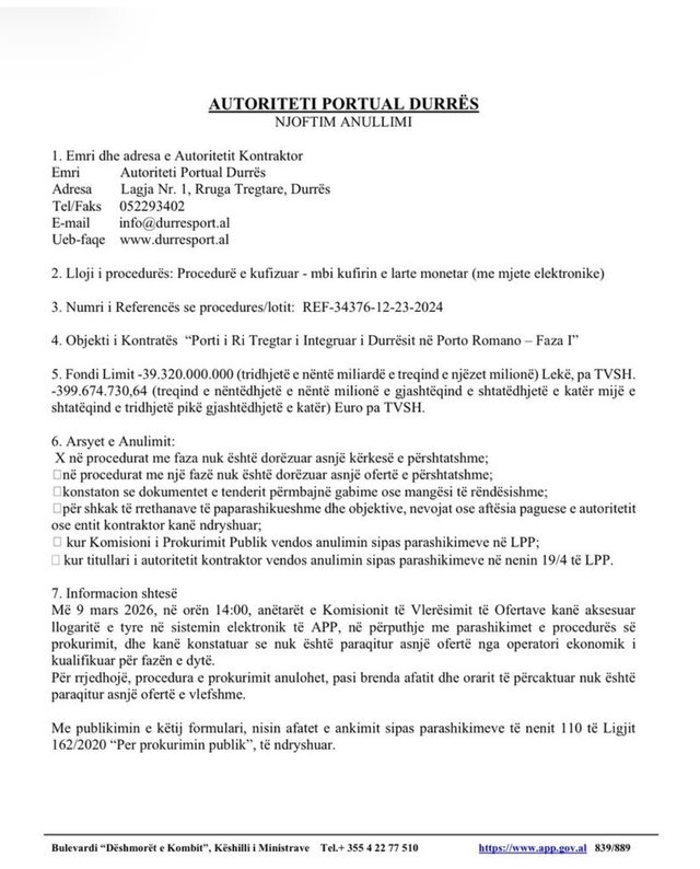 Tenderi për ndërtimin e Portit të Ri tregtar në Porto Romano është anulluar, njoftoi Agjencia e Prokurimeve Publike. Arsyeja e anulimit është mungesa e ofertës financiare nga kompania e vetme që mbeti në garë, Achirodon.