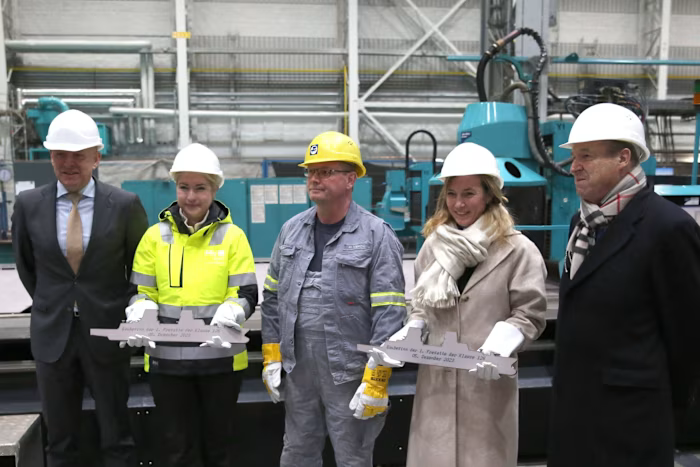 Nga e majta: Roland Briene i Damen; ministrja e shtetit Manuela Schwesig; operatori i motorit Marko Vierow; ministrja e vogël e mbrojtjes Siemtje Möller; dhe Friedrich Lürssen i Lürssen Group vizitojnë kantierin detar Peene në Gjermaninë veriore në 2023