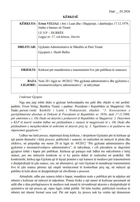“Lidhur me këtë proces, nëpërmjet kësaj kërkese, i drejtohem Gjykatës për të kërkuar që një parim themelor i këtij procesi, publiciteti i seancës, të realizohet në mënyrë të plotë dhe efektive, në përputhje me nenin 20 të ligjit nr. 49/2012 “Për gjykatat administrative dhe gjykimin e mosmarrëveshjeve administrative”, të ndryshuar, i cili përcakton se shqyrtimi gjyqësor është i hapur për publikun.